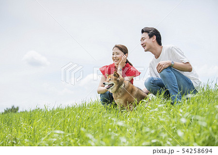 犬・ペットを連れてドライブ・デイキャンプ・キャンプ・車中泊する若いアジア人カップル・夫婦・キャンパー