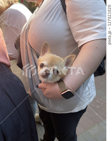 A Charming and Adorable Chihuahua Snuggled Comfortably in Loving Arms for Affectionate Moments