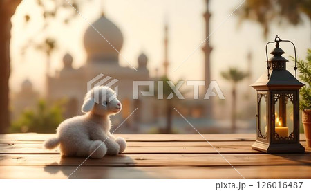 A fluffy lamb rests on a wooden table accompanied by a lantern, with a mosque visible in the background, capturing the essence of Eid al-Adha