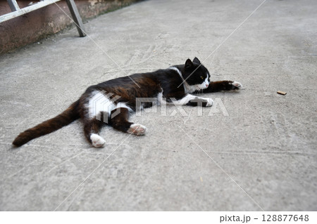 A black cat lying asleep on the sidewalk next to the wall. Abandoned street