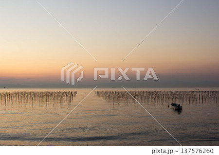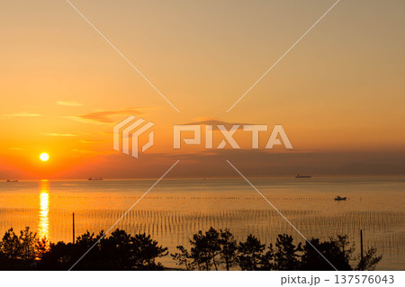 知多半島・伊勢湾の海苔養殖風景と沈む夕日
