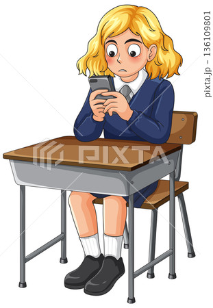 Worried Schoolgirl Sitting at Desk Using Smartphone
