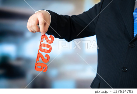 A businessman in a suit holds the numbers 2026 upside down.
