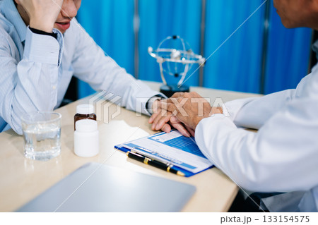 Young Asian man discusses mental health with psychiatrist in office. Emotional support, anxiety, therapy, and compassionate care.