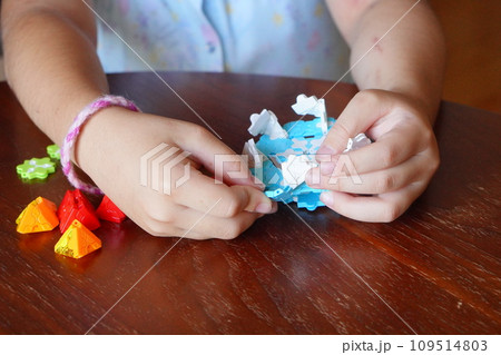 ブロック遊びをしている小学4年生の女の子の手元。