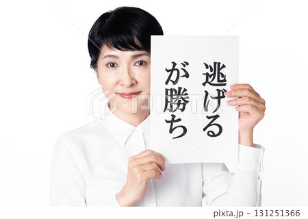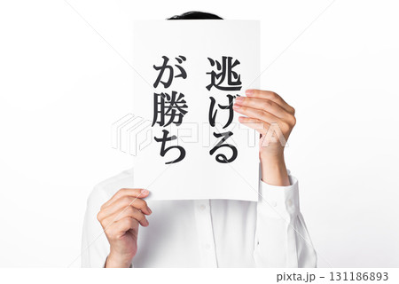 逃げるが勝ちと書かれた紙を持つ白いシャツを着た人物