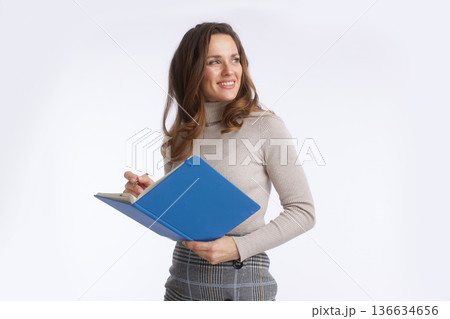 Smiling Professional Woman Planning with Open Notebook