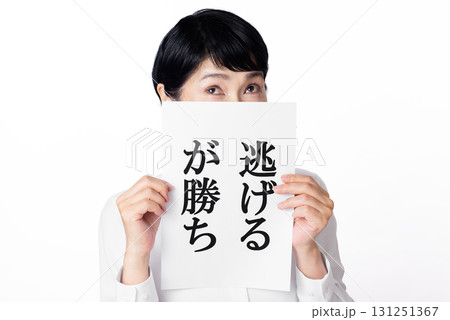 逃げるが勝ちと書かれた紙を持つショートヘアーのシニア女性