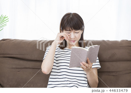 漫画本を読んで泣いている女性