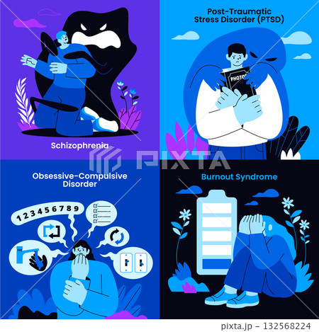 Four mental health conditions illustrated with expressive character emotions in hand-drawn flat style