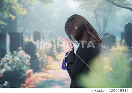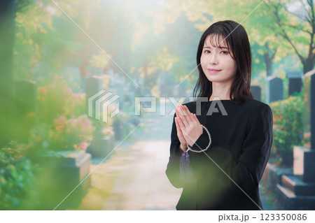 喪服を着て墓地で手を合わせる女性