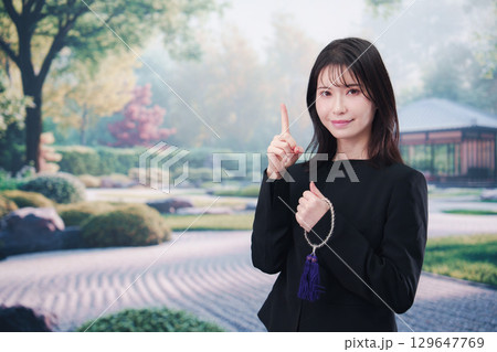 喪服を着て数珠を持って手を合わせる女性