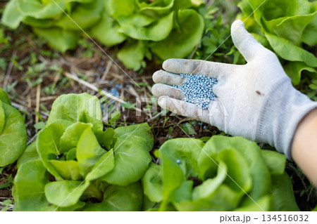野菜畑に青い粒状の化成肥料を撒く手袋の手 効率的な栄養補給と追肥