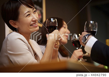 白背景の赤ワインを飲むミドルエイジの女性2人