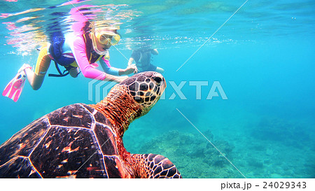 沖縄 渡嘉敷島の水中撮影 シュノーケリングでウミガメを観察する小学生と母親