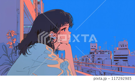 ベランダから夕方の街を眺める女性