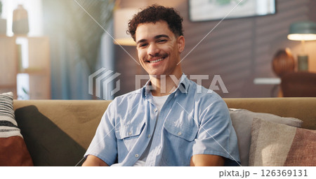 Happy, portrait and man on couch, home and smile for break on weekend, calm and peace in living room. Relax, person and comfortable on sofa in lounge, rest and chilling in morning, house or apartment