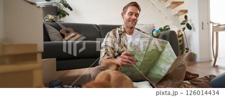Portrait of young man, traveller, sitting packing suitcase, looking at travel map, choosing holiday destination, studying the route on vacation