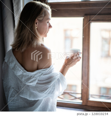 Happy woman enjoy coffee while looking out window in kitchen. No plans, simple living, mindfulness