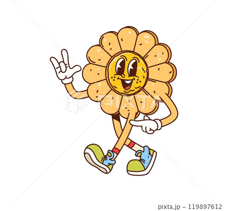 Cartoon groovy cookie, pastry and bakery character. Isolated vector happy sweet dessert personage in shape of flower wearing sneakers, flashing rock sign with cheerful expression, exuding quirky vibes