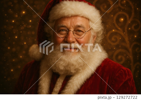 Santa in Velvet Suit with Glasses and Golden Swirls.