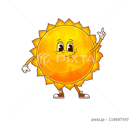 Cartoon sun solar system groovy planet character with cheerful expression and playful pose. Isolated vector cute and quirky space personage radiating retro vibes, fun and joy for astronomy learning