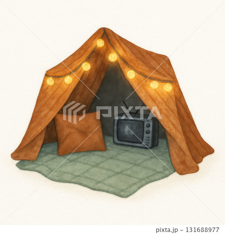 Cozy blanket fort with string lights, soft pillow, and vintage television inside, creating warm and inviting atmosphere perfect for relaxing or watching movies