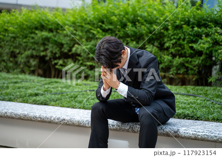 頭を抱えて落ち込む男性 ビジネスマン モノクロ