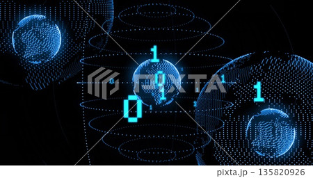 Rotating sphere point-matrices spinning in network space with binary bits 0 and 1, concentric rings
