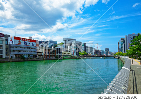 那珂川の春吉橋と中洲懸橋の間から見上げる都市風景