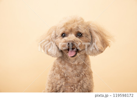 ベージューバックと微笑むトイプードルのバストアップ