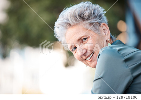 City, success and portrait of senior woman outdoors thinking of future, ideas and vision for corporate company. Leadership, motivation and face of elderly female entrepreneur sitting in urban town