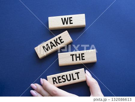 We make the result symbol. Concept words We make the result on wooden blocks. Beautiful deep blue background. Businessman hand. Business concept. Copy space.