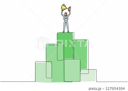 Continuous one line drawing young businesswoman standing on big graphic bar and lifting trophy. Winner pose. Success, goal, achievement and concept. Single line draw design vector graphic illustration