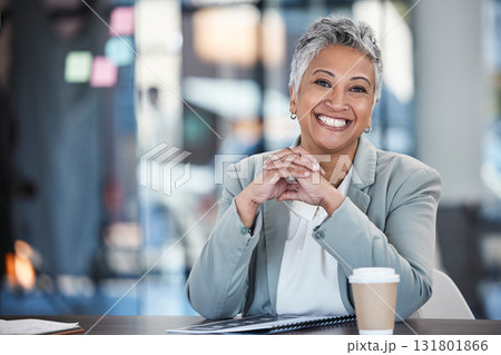 Smile, executive and portrait of a woman in business for working, success and goals. Corporate, happy and mature office employee sitting at a desk to start work in the morning at a legal company
