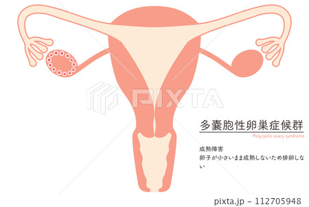多嚢胞性卵巣症候群(成熟障害)の図解イラスト、子宮・卵巣の解剖図