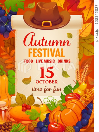 Autumn festival party flyer with fall harvest of fruits and leaves, vector banner. Autumn celebration flyer for live music, food and drinks invitation with pumpkins, apple pie and maple or oak leaves