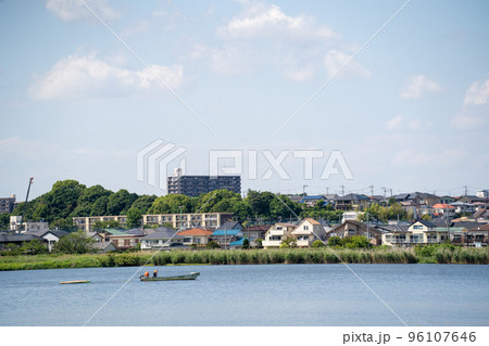 初夏の手賀沼に浮かぶボートをサイクリングロードから眺める