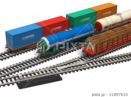 Railway locomotive and wagons. Side view. Isolated on a white background. Vector illustration.