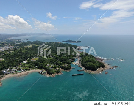 阿久根港の上空から戸柱自然公園の海岸線の空撮
