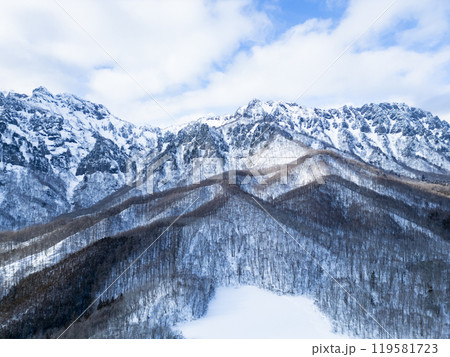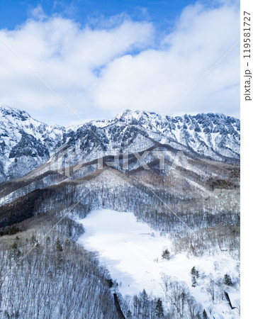 冬の鏡池と戸隠連峰(ドローン空撮) 長野県長野市戸隠