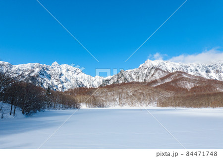 冬の鏡池と戸隠連峰 長野県長野市戸隠