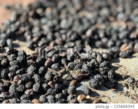 Dried black grapes on coarse sandy surface with focus on texture and natural details