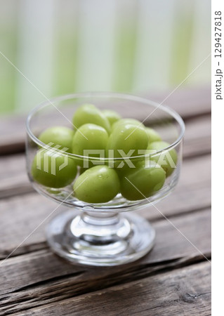 デザートグラスに入れた房から取ったハネ品のシャインマスカット