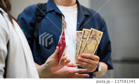日本円とパスポートの受け渡し ■撮影協力:関西国際空港(KIX)
