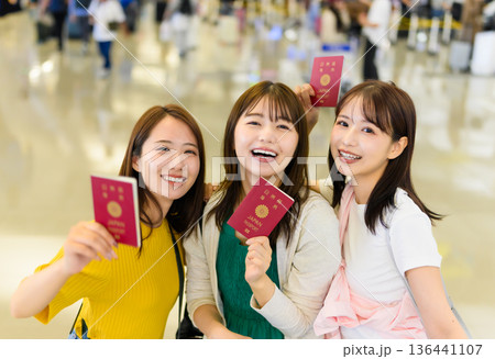 パスポートを持つ女性三人組 ■撮影協力:関西国際空港(KIX)
