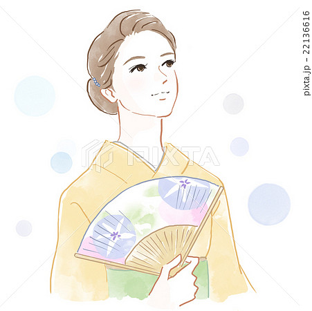 うちわであおいでいる着物を着た女性