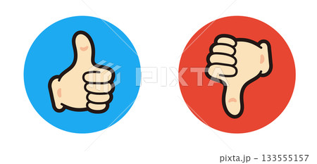 評価のマーク。親指を立てたアイコン、親指を下げたアイコン。漫画風のグッドサイン。