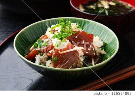 てこね寿司風(カツオ刺身しょうゆ漬け)イメージ。ぱぱ〜んアレンジのオリジナル創作料理。