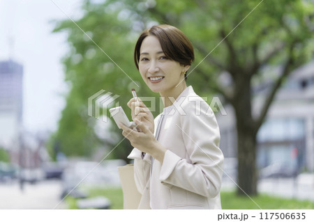 公園で口紅を治すミドルエイジの女性